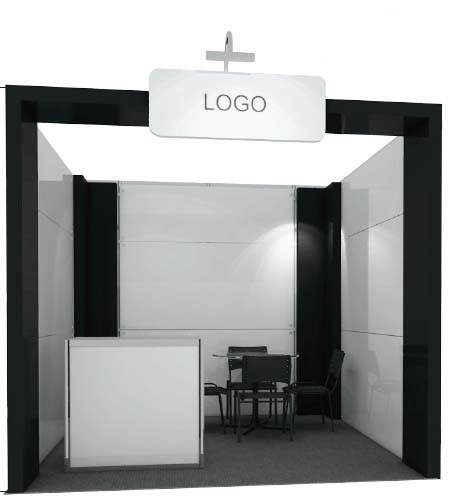 - Montagem básica (piso, paredes divisórias, 1 mesa, 4 cadeiras, 1 balcão, testeira com logo da empresa)